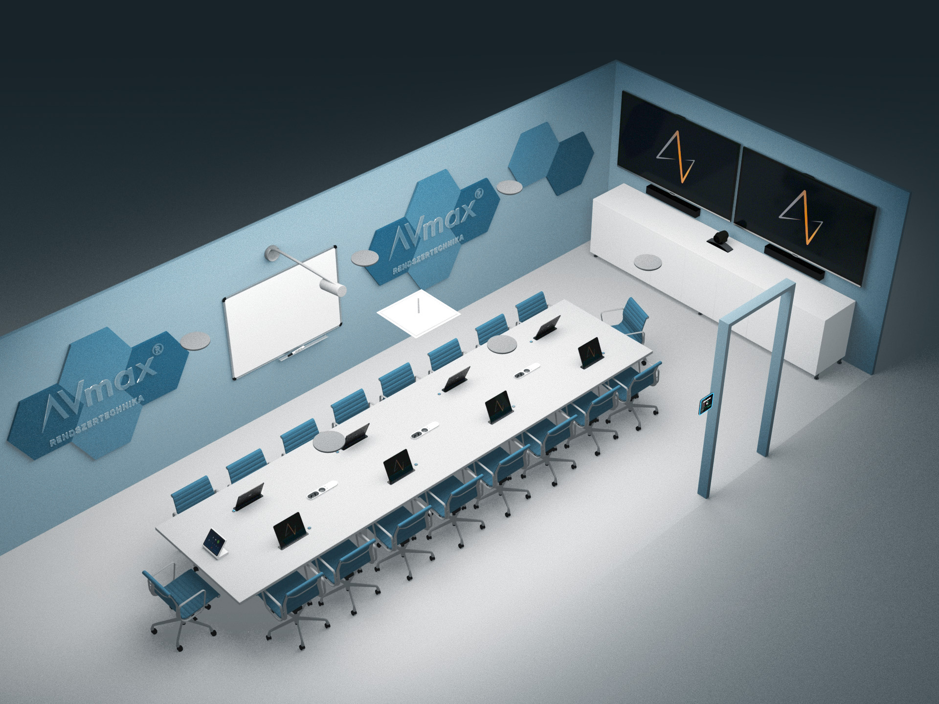 Az akusztikus panelek feladata a terem oldalfalairól visszaverődő hangok csökkentése, javítva a videókonferencia hívások minőségét: „teres hang” megszűntetése.